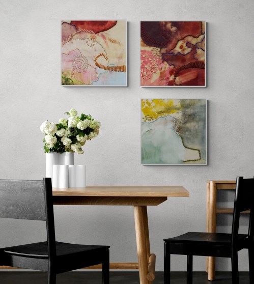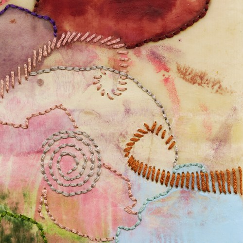 Each month in 2022 I’ll be featuring two MACRO prints in a special half-off sale. These one-of-a-kind digital prints will only be available at this price during their featured month. Each print measures 20″ x 20″ and is made by scanning and enlarging mixed media works made with encaustic paint and embroidery thread. October’s featured prints come from ASD #55 in the WAX PAPER THREAD series.