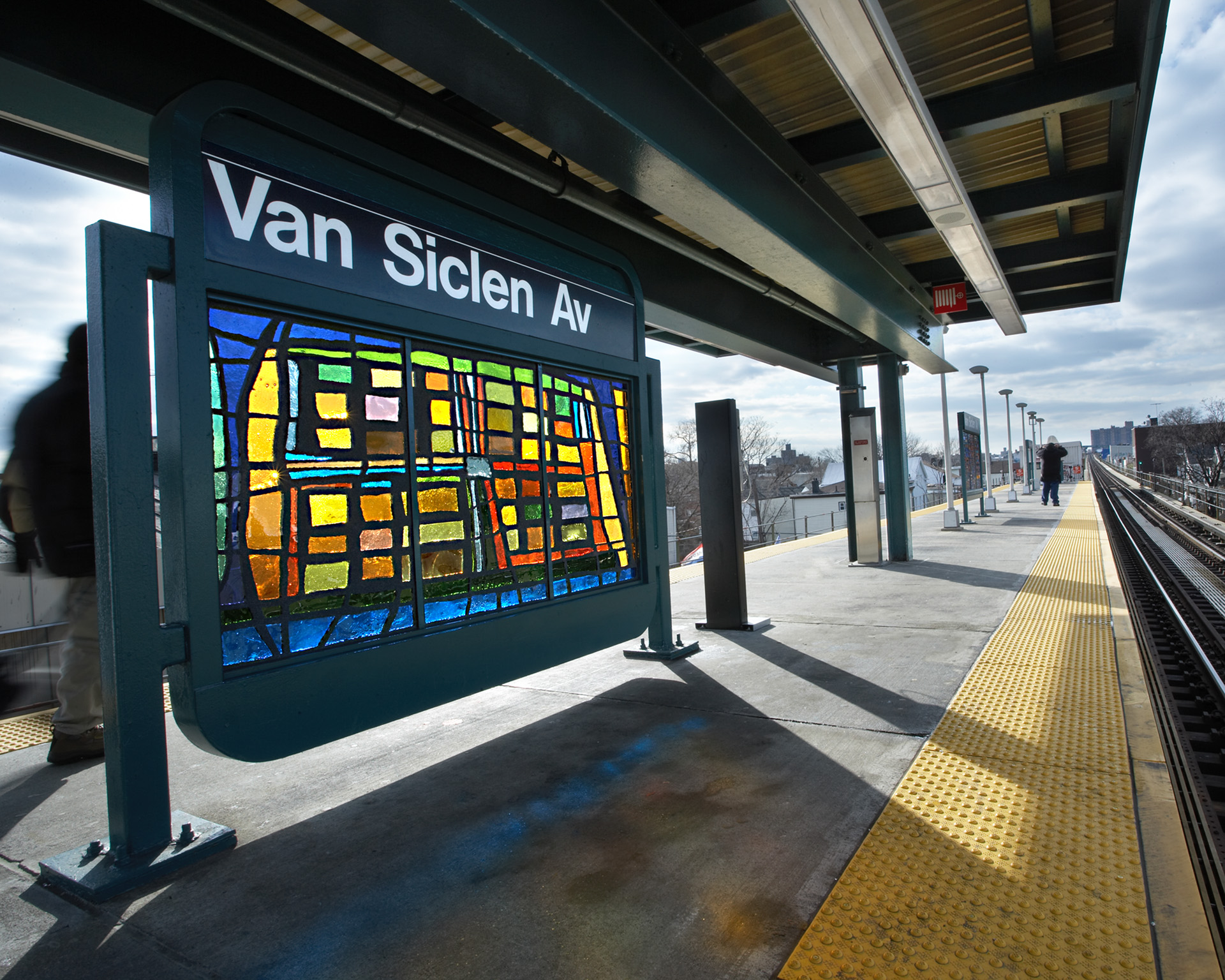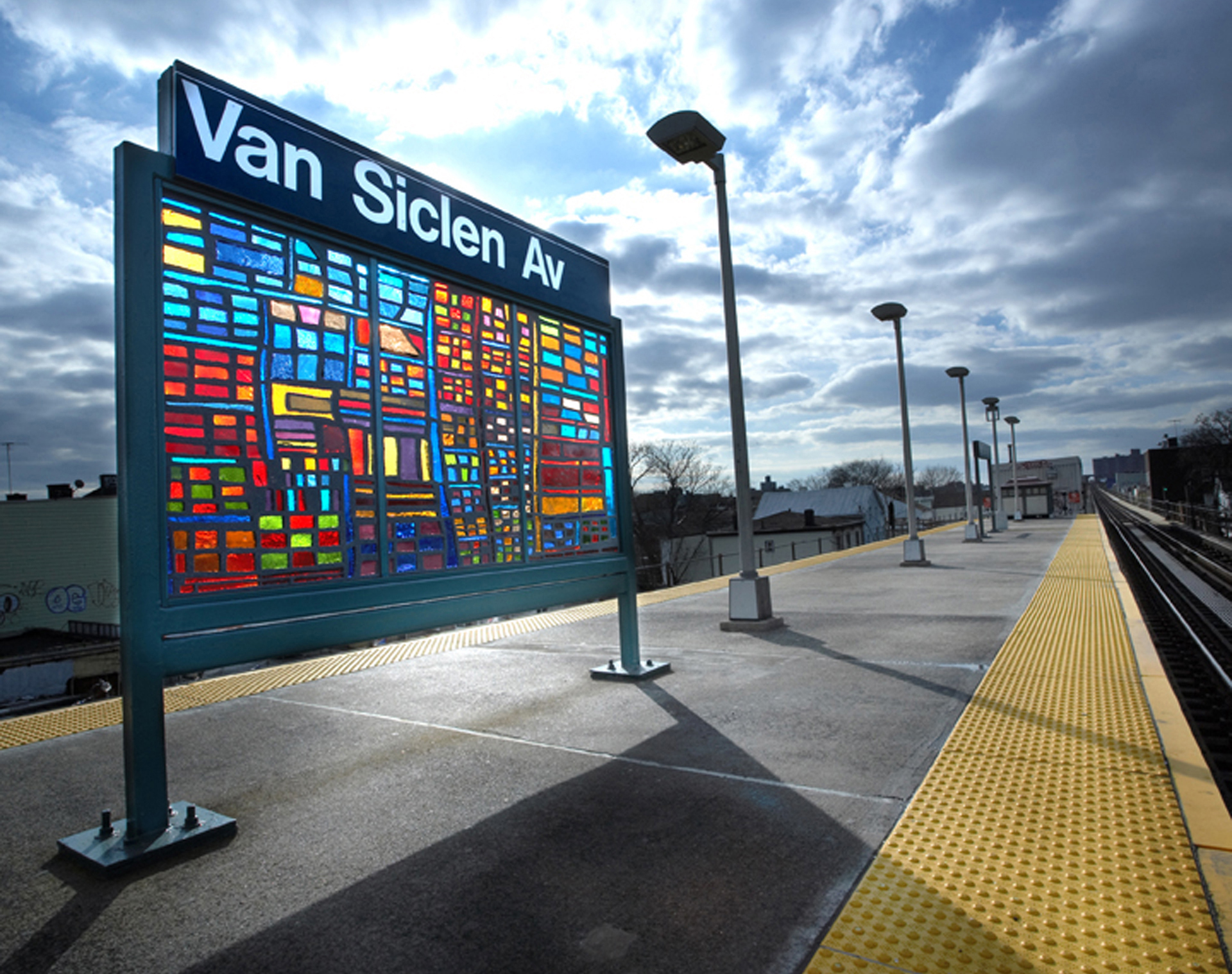 Seven faceted glass windscreens commissioned by the NYC MTA’s Arts For Transit Program for the elevated Van Siclen Avenue Station on the Jamaica Line in Brooklyn, NY. Fabricated by Willet Hauser Architectural Glass. Installed 2007