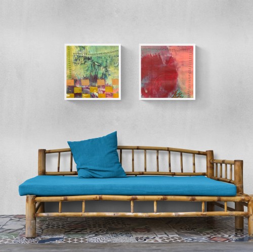 Each month in 2022 I’ll be featuring two MACRO prints in a special half-off sale. These one-of-a-kind digital prints will only be available at this price during their featured month. Each print measures 20″ x 20″ and is made by scanning and enlarging mixed media works made with encaustic paint and embroidery thread. September’s featured prints come from ASD #27 in the WAX PAPER THREAD series.